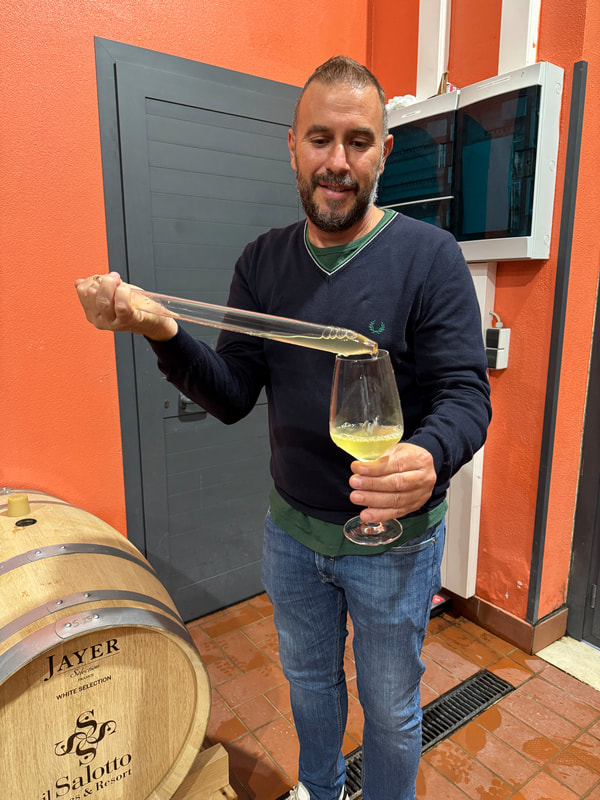 Damiano empfing uns herzlich und führte uns direkt in den Weinkeller. Wir starteten mit einer Fassprobe des erst vier Wochen im Ausbau befindlichen Sollievo DOC – einer Cuvée aus Viognier und Sémillon. Frisch, klar, aromatisch – erstaunlich präzise für dieses frühe Stadium. Anschliessend probierten wir einen Cabernet Sauvignon aus dem Fass. Was sich im Glas zeigte, war beeindruckend: Tiefe Aromen dunkler Schokolade – ein Wein mit grossem Potenzial.